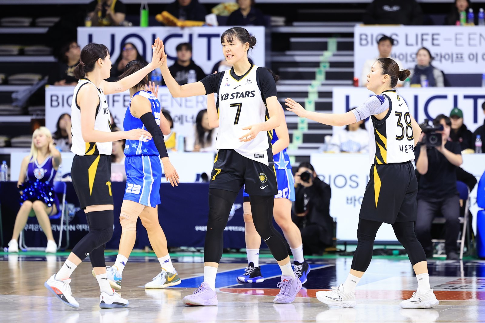 KB스타즈 박지수가 28일 아산 이순신체육관서 열린 우리은행전에서 동료들과 하이파이브를 하고 있다. 사진제공|WKBL