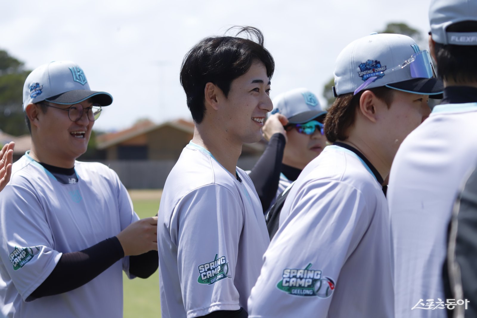 KT가 필승조의 양과 질 두 마리 토끼를 잡으려고 한다. 스기모토 코우키(가운데)가 25일 호주 질롱 베이스볼 센터에서 열린 스프링캠프 도중 웃고 있다. 사진제공|KT 위즈