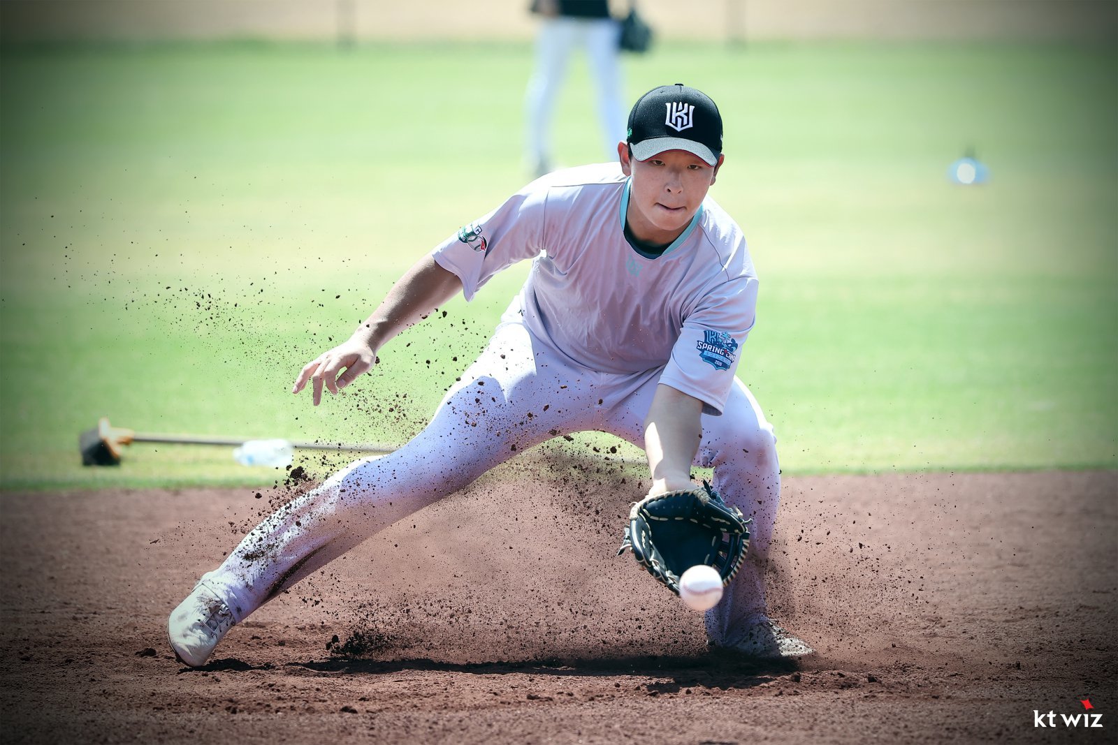 KT 신인 이강민이 지난달 30일 호주 질롱 베이스볼 센터에서 열린 스프링캠프 도중 수비 훈련을 소화하고 있다. 사진제공|KT 위즈