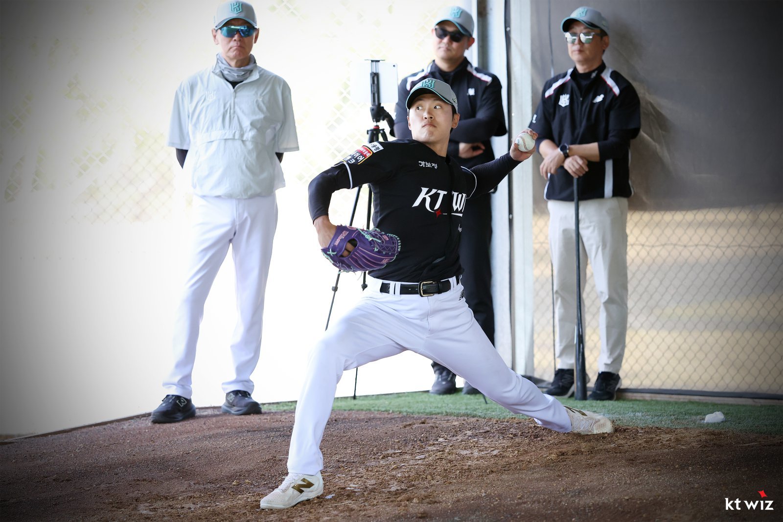 KT 전용주가 지난달 30일 호주 질롱 베이스볼 센터에서 열린 스프링캠프 도중 트래킹 데이터를 측정하며 불펜피칭을 하고 있다. 사진제공|KT 위즈