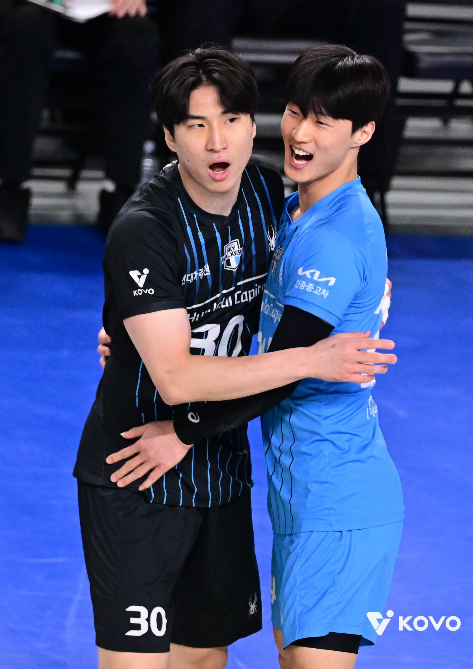 현대캐피탈 리베로 임성하(오른쪽)가 1일 천안 유관순체육관서 열린 OK저축은행과 홈경기서 팀이 세트 스코어 3-0 완승을 거두자 신호진과 함께 환하게 웃고 있다. 사진제공│KOVO