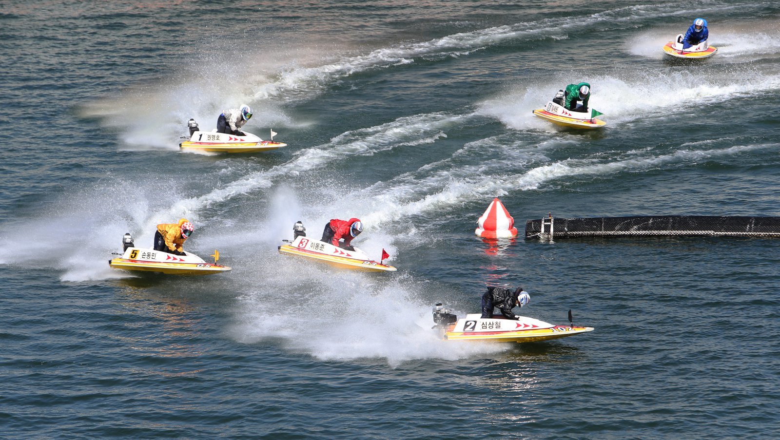 미사리경정장에서 선수들이 턴마크를 돌며 경합을 벌이고 있다.
