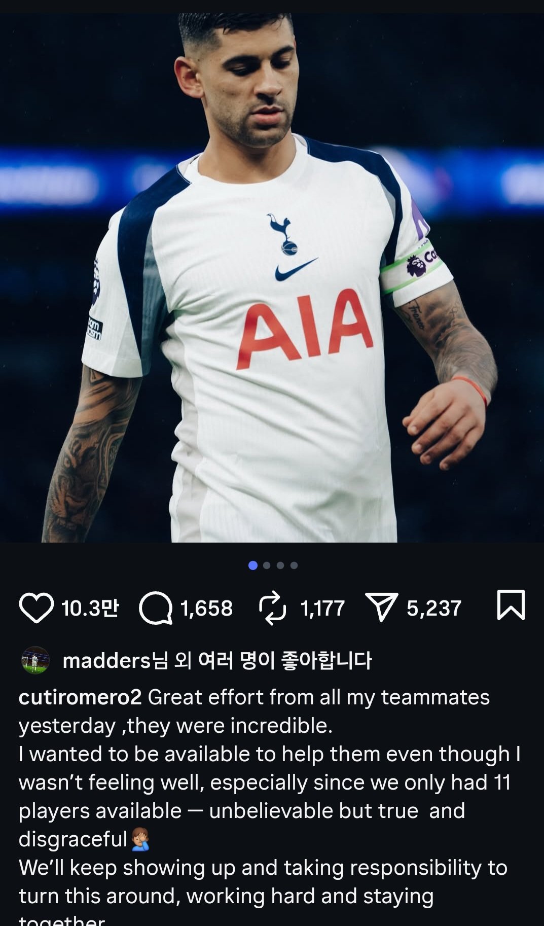 구단 수뇌부의 생각은 파악하기 어려우나 로메로의 게시물은 동료들의 많은 공감을 받았다. 맨시티전서 멀티골을 터트린 도미닉 솔란케와 갤러거, 스펜스, 파페 마타르 사르, 단소 등의 ‘좋아요’를 받았다. 선수들은 동료들이 대거 쓰러지며 위기 의식을 크게 느끼지만 정작 토트넘은 이번 시즌도 ‘어떻게든 되겠지’라는 무책임한 모습이다.