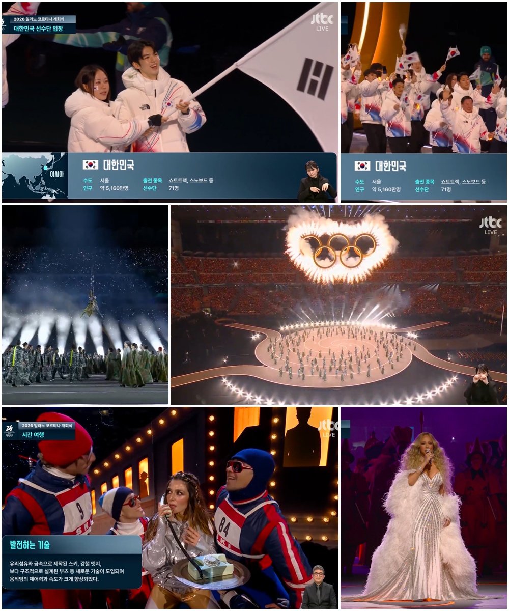 이번 개회식에서 대한민국 선수단은 피겨스케이팅의 차준환과 스피드스케이팅의 박지우를 공동 기수로 내세워 전체 참여국 중 22번째로 입장했다. 동계올림픽 사상 최초의 ‘분산 개회식’으로 치러진 가운데, JTBC는 다원 생중계를 통해 각지에 흩어진 선수단의 생생한 표정을 안방에 전달했다.