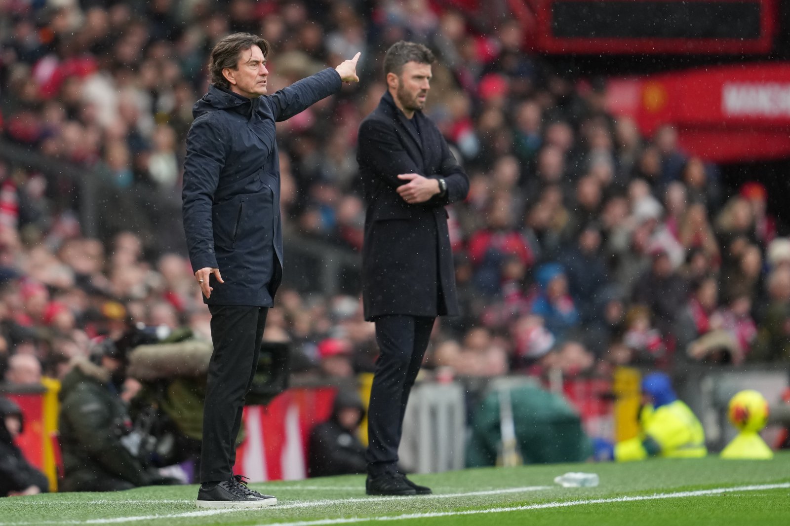 마이클 캐릭 맨유 감독(오른쪽)이 7일(한국시간) 토트넘과 홈경기 도중 그라운드를 바라보고 있다. 맨체스터|AP뉴시스