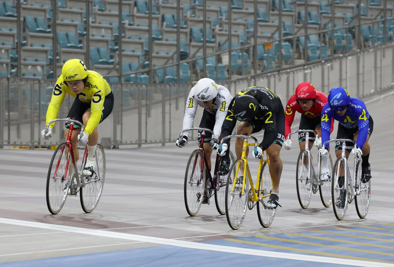 경륜 30기 윤명호(맨 왼쪽)가 빼어난 기량과 함께 신인답지 않은 노련한 경기 운영을 앞세워 우수급에서 돌풍을 일으키며 팬들과 전문가들의 눈길을 사로잡고 있다. 사진제공 | 국민체육진흥공단