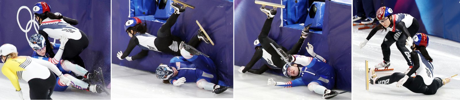 쇼트트랙대표팀 김길리(오른쪽 위)가 10일(한국시간) 밀라노 아이스스케이팅 아레나서 열린 밀라노동계올림픽 2000m 혼성계주 레이스 도중 미끄러진 코린 스토다드(미국)와 충돌해 넘어지고 있다. 마지막 사진은 넘어진 김길리에게 배턴을 넘겨받는 최민정(왼쪽). 밀라노ㅣ뉴시스