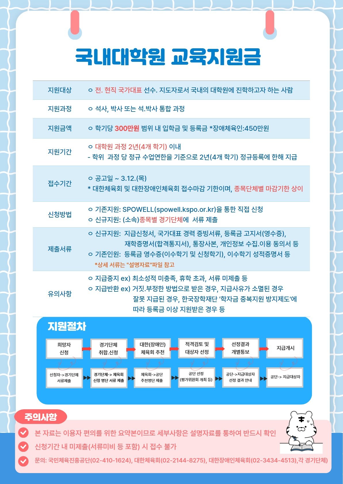 ‘국내 대학원 교육 지원금’은 전현직 국가대표 선수 또는 지도자에게 국내 대학원의 석·박사 학위 취득 비용을 지원하는 사업으로, 국가대표 선수 또는 지도자로 활동한 경력을 보유한 사람은 누구나 지원할 수 있다.