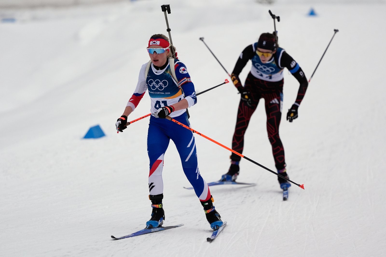 예카테리나 압바꾸모바(왼쪽)가 12일(한국시간) 이탈리아 안테르셀바 바이애슬론 아레나서 끝난 2026 밀라노·코르티나담페초동계올림픽 바이애슬론 여자 15㎞ 레이스에서 레이스를 펼쳐고 있다. 안테르셀바(이탈리아)|AP뉴시스