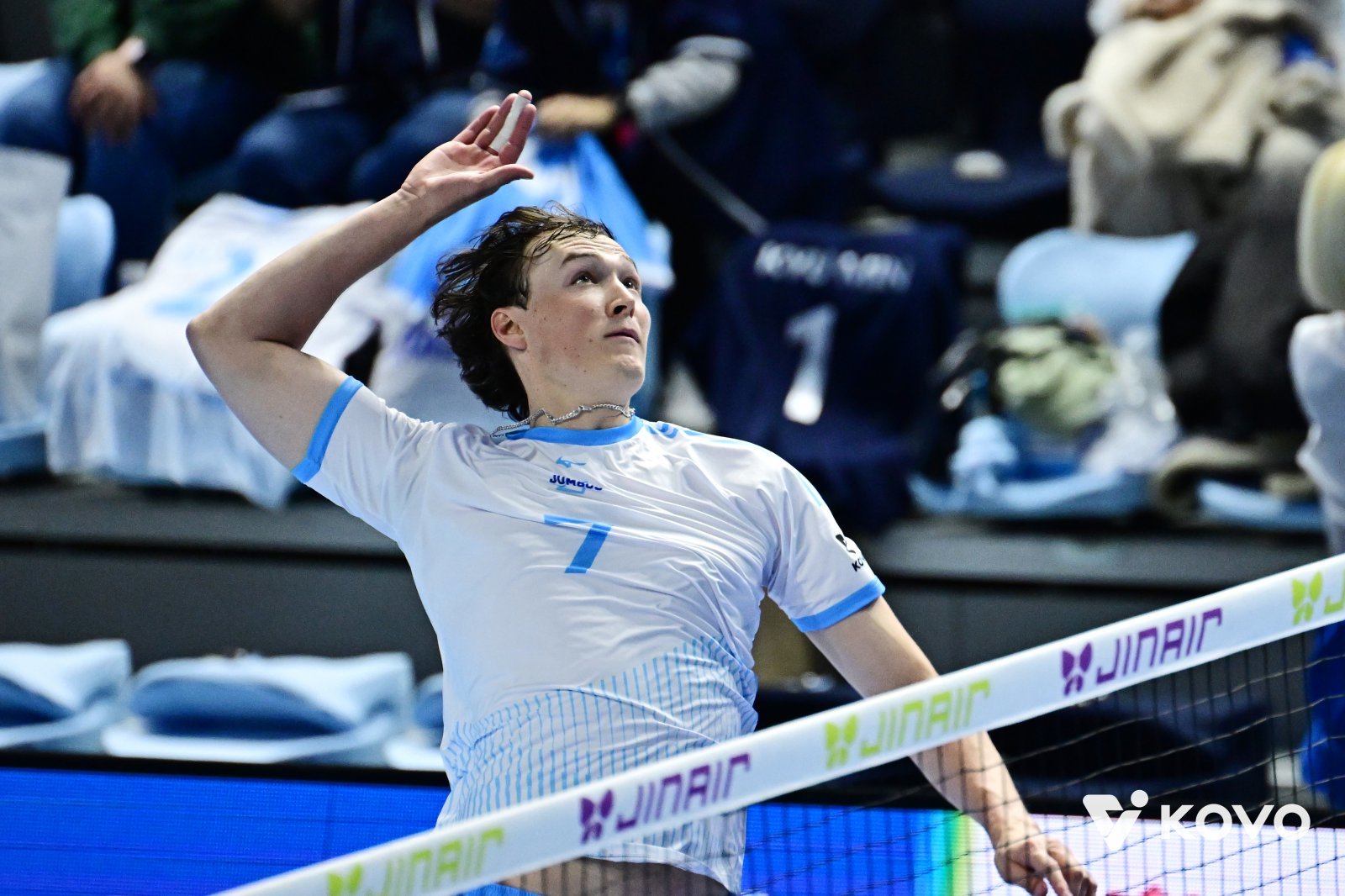 대한항공은 아웃사이드 히터 이든(사진)과 리베로 강승일 조합이 자리를 잡아야 현대캐피탈과 선두 경쟁서 앞서나갈 수 있을 것으로 보인다. 사진제공│KOVO