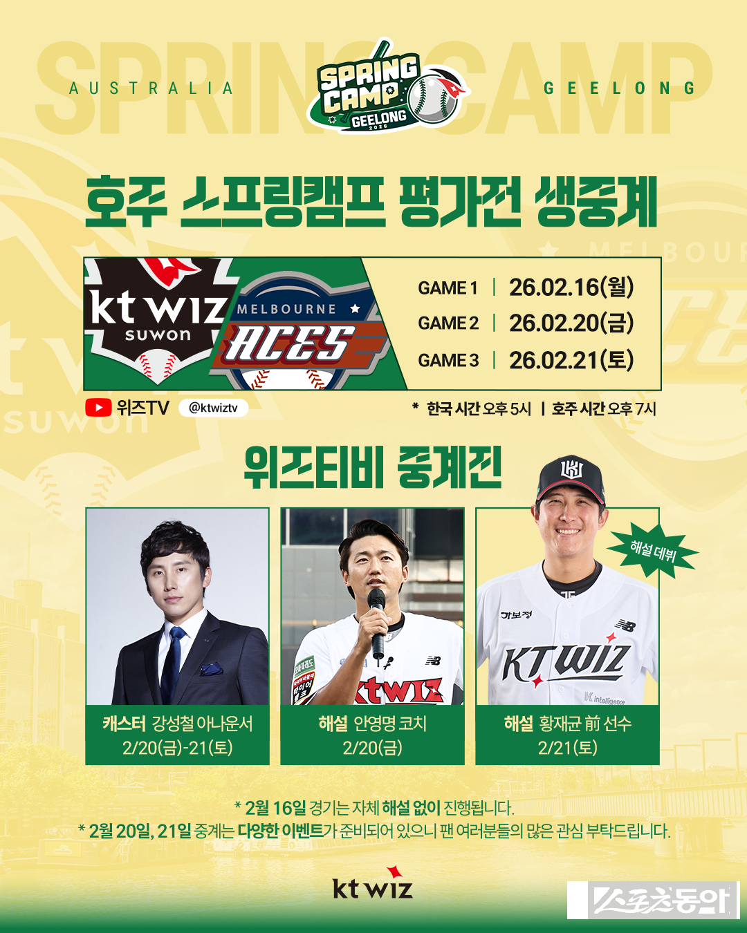 [스포츠동아 김현세 기자] 호주 질롱에 스프링캠프를 차린 KT 위즈가 호주프로야구(ABL) 멜버른 에이시스와 평가전을 생중계한다.