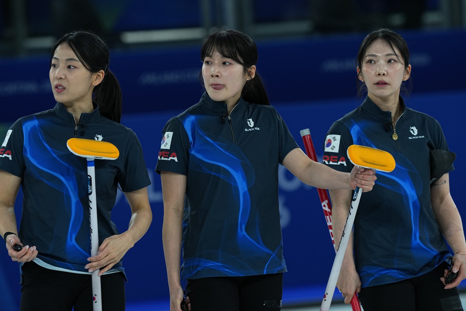 대한민국 여자컬링대표팀이 15일(한국시간) 코르티나 컬링 스타디움서 열린 덴마크전에서 3-6으로 졌다. 경기 중인 김민지, 설예은, 김수지(왼쪽부터). 코르티나ㅣAP뉴시스
