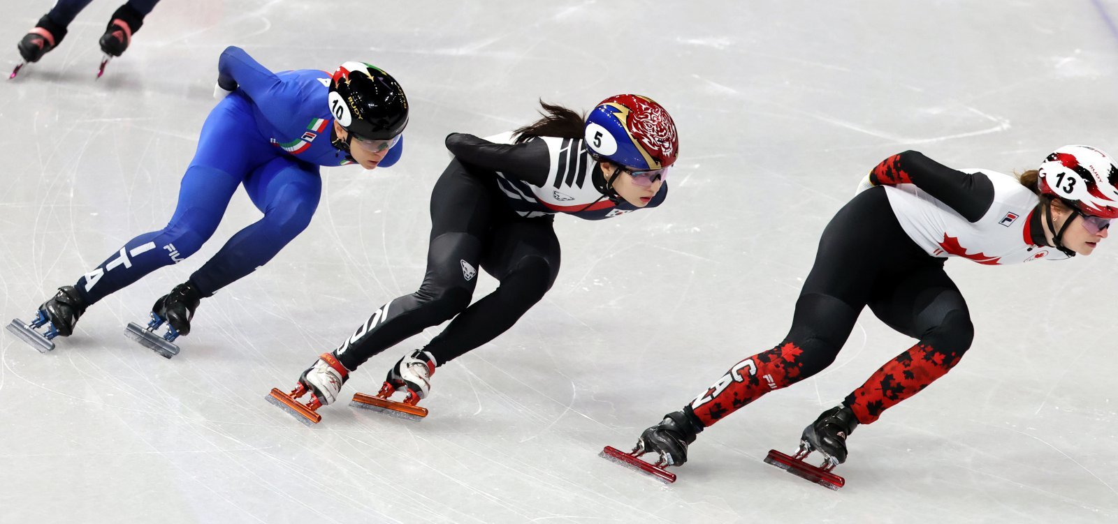 최민정(가운데)이 16일(한국시간) 밀라노 아이스스케이팅 아레나에서 열린 쇼트트랙 여자 1000m 준준결선에서 레이스를 펼치고 있다. 밀라노ㅣ뉴시스