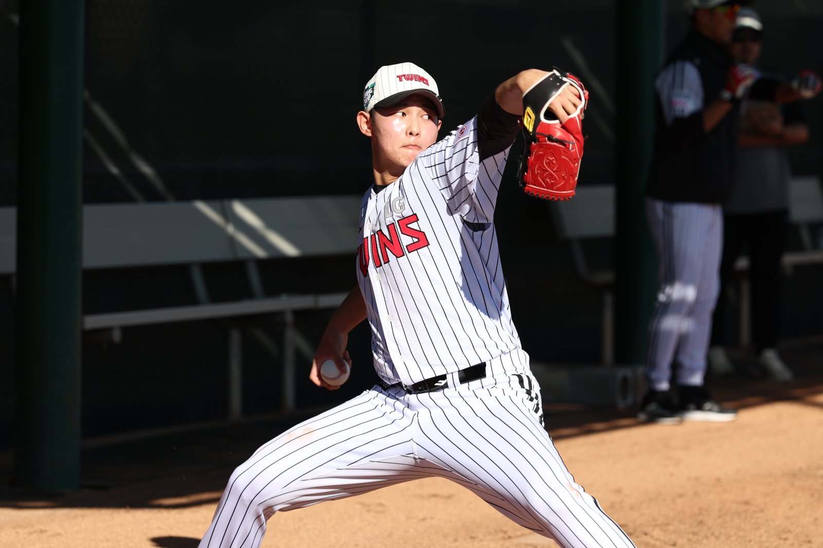 LG 김영우가 미국 애리조나주 스코츠데일서 열리고 있는 팀 스프링캠프서 불펜 피칭에 앞서 몸을 풀고 있는 모습. 사진제공|LG 트윈스