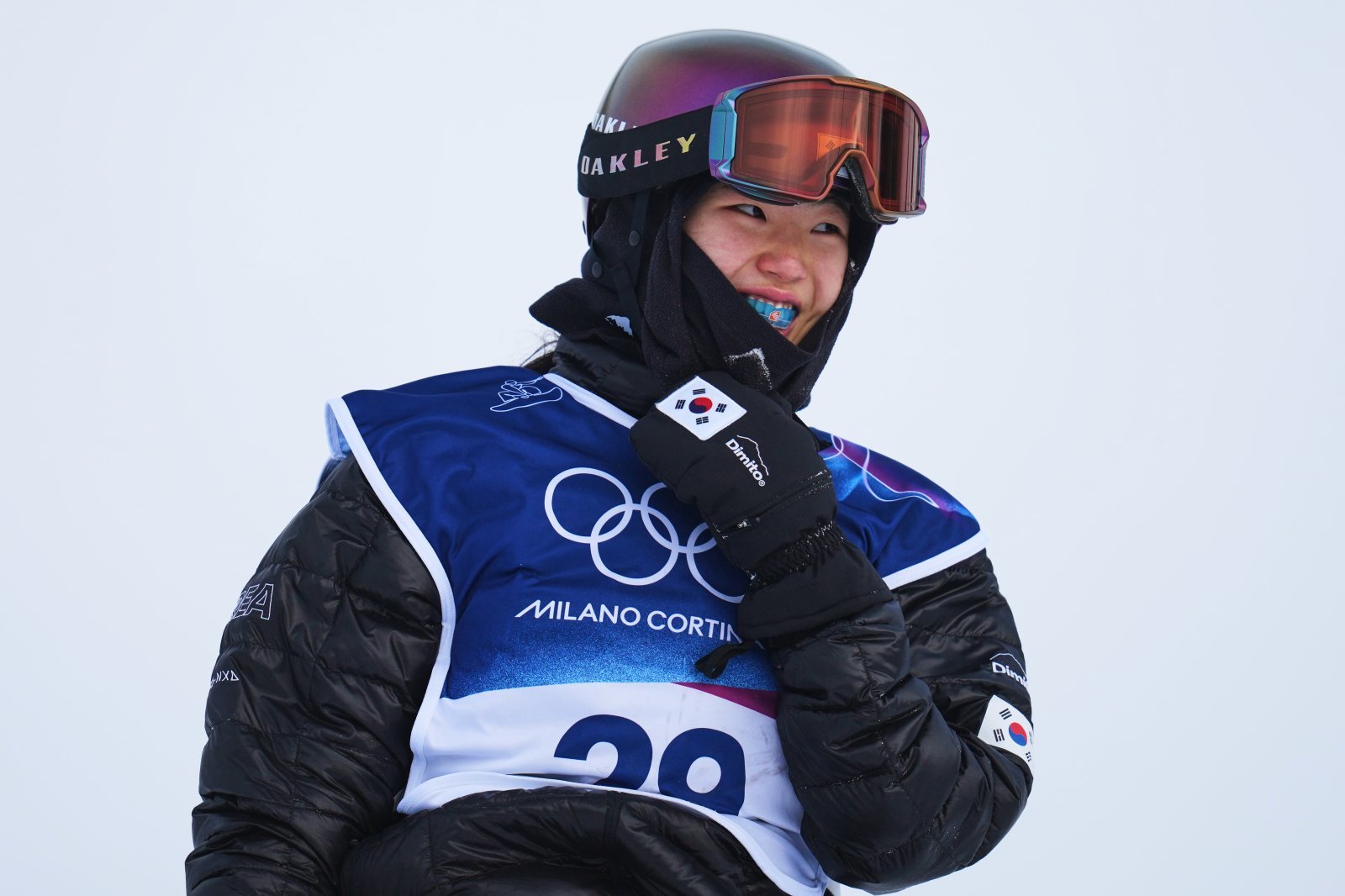 유승은이 19일(한국시간) 리비뇨 스노파크에서 열린 스노보드 여자 슬로프스타일 결선에서 연기를 마친 뒤 웃고 있다. 리비뇨ㅣAP뉴시스