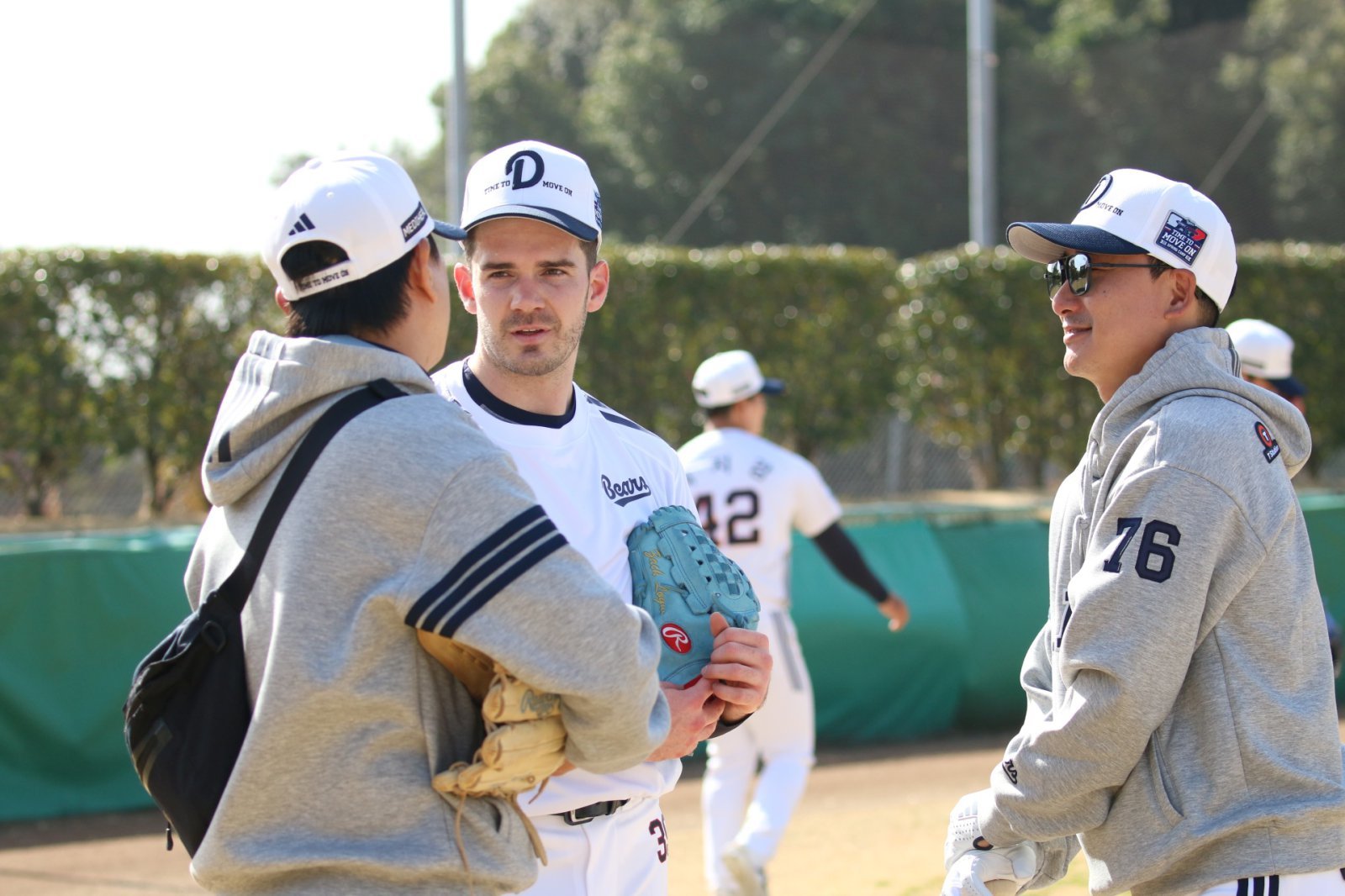 두산 잭로그(왼쪽)가 23일 스프링캠프지인 일본 미야자키에서 통역을 통해 정재훈 투수코치와 대화를 나누고 있다. 사진제공ㅣ두산 베어스