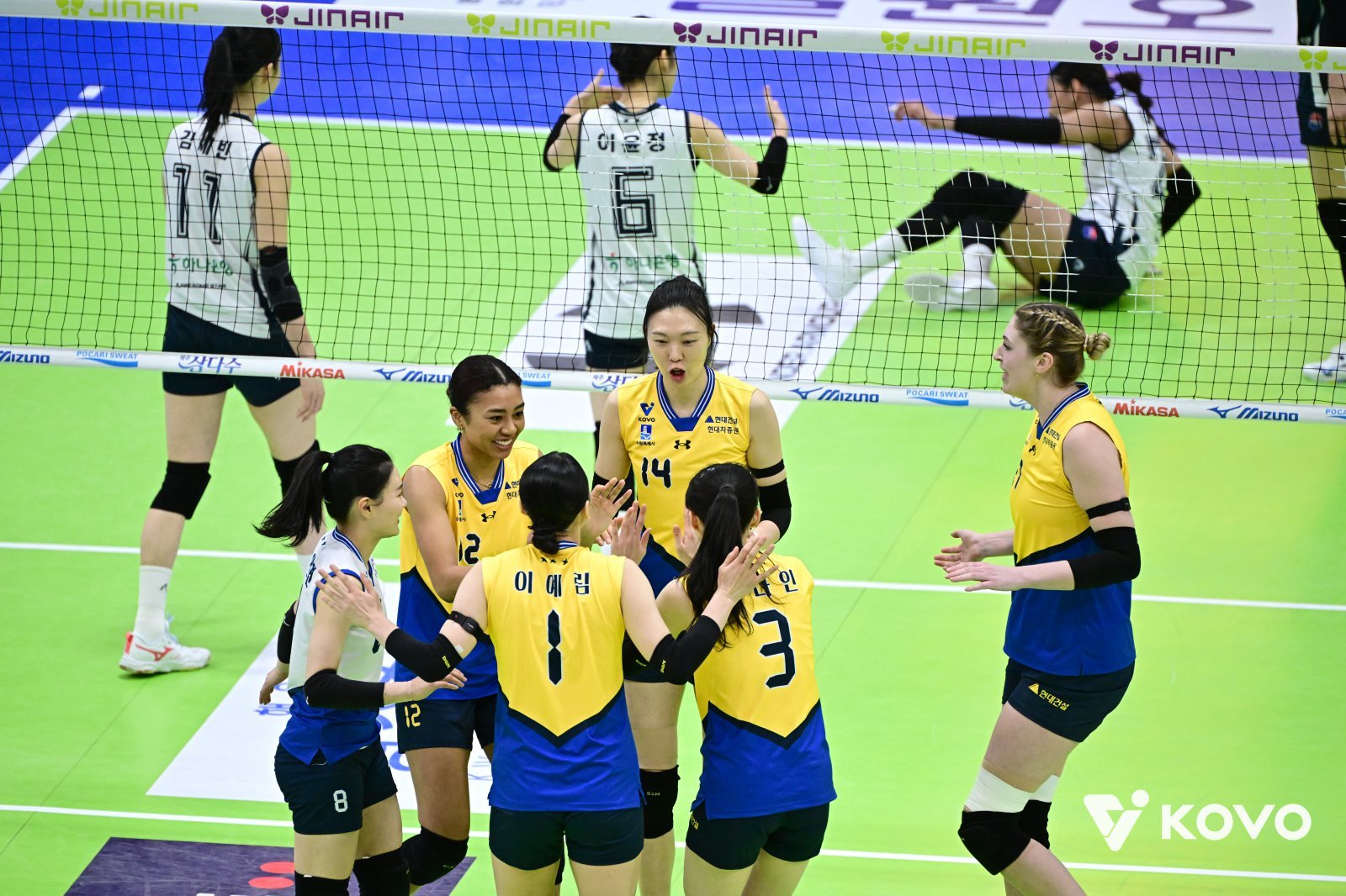 현대건설은 24일 수원체육관서 열린 ‘진에어 2025~2026 V리그’ 여자부 정규리그 6라운드 홈경기에서 1위 한국도로공사를 세트스코어 3-2(26-24 25-17 23-25 10-25 15-11)로 꺾었다.