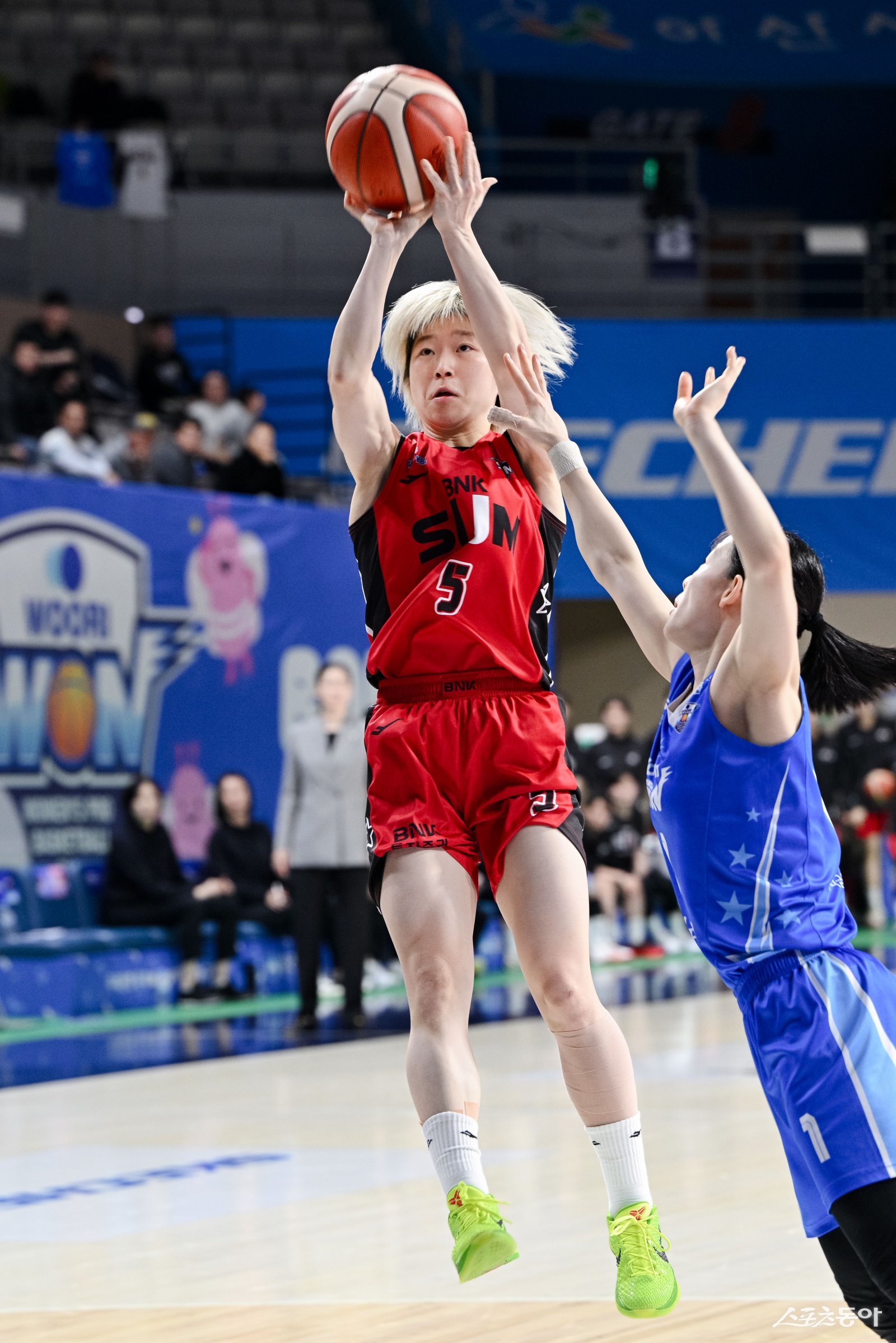 BNK 선수들은 똘똘 뭉쳤다. 안혜지는 이날 3점슛 6개를 포함한 20점·7리바운드·5어시스트로 펄펄 날았다. 이소희(14점·5리바운드)와 박혜진(7점·9리바운드)도 공수서 지원 사격했다.