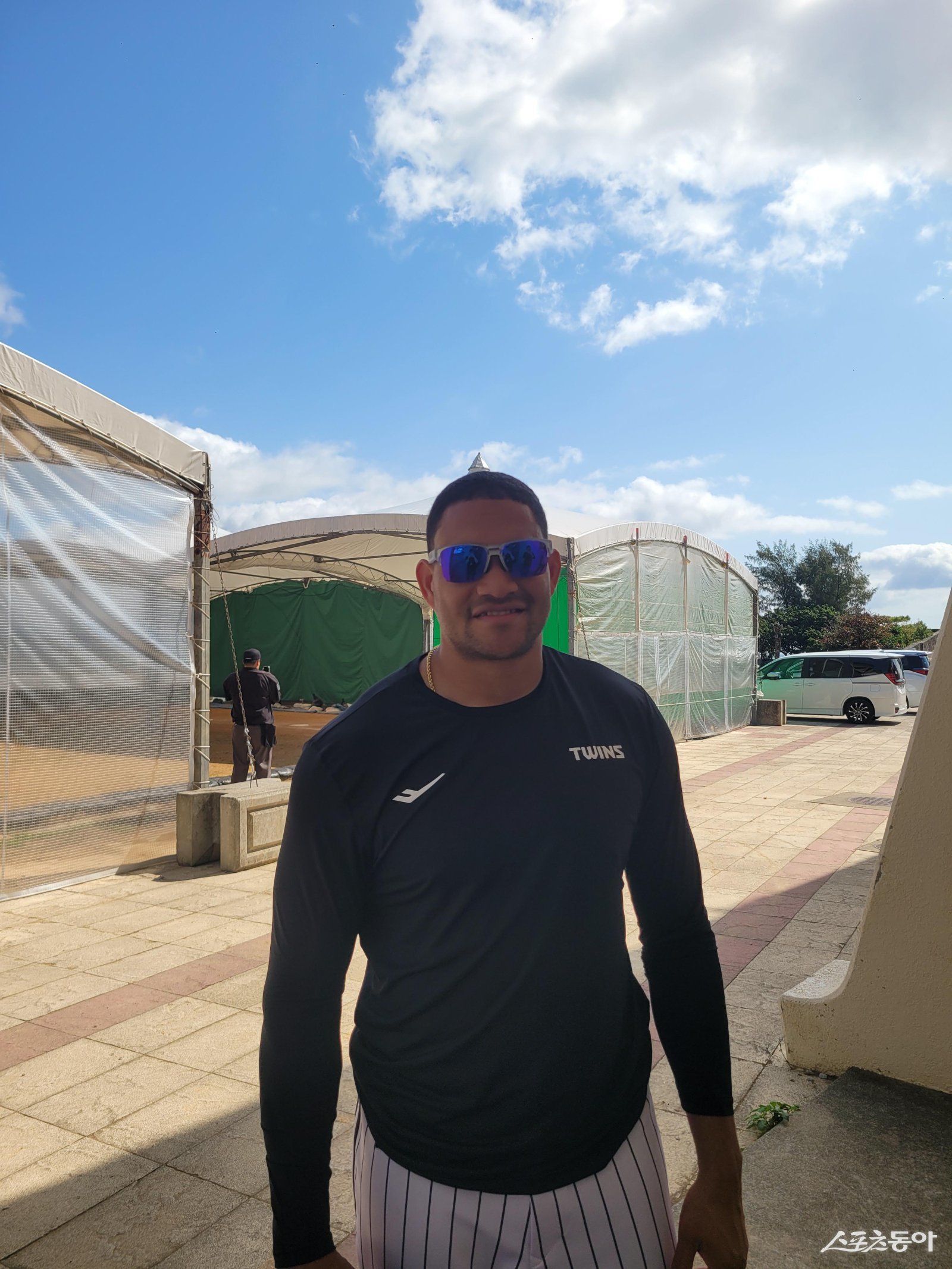 LG 요니 치리노스가 26일 일본 오키나와 이시카와구장서 불펜 피칭을 마친 뒤 취재진과 인터뷰를 진행하고 있다. 치리노스는 팀 동료였던 김현수(KT)를 상대타자로 만나는 것에 대해 “박동원과 얘기를 많이 나눴다”라며 크게 웃어보였다. 오키나와|장은상 기자 award@donga.com