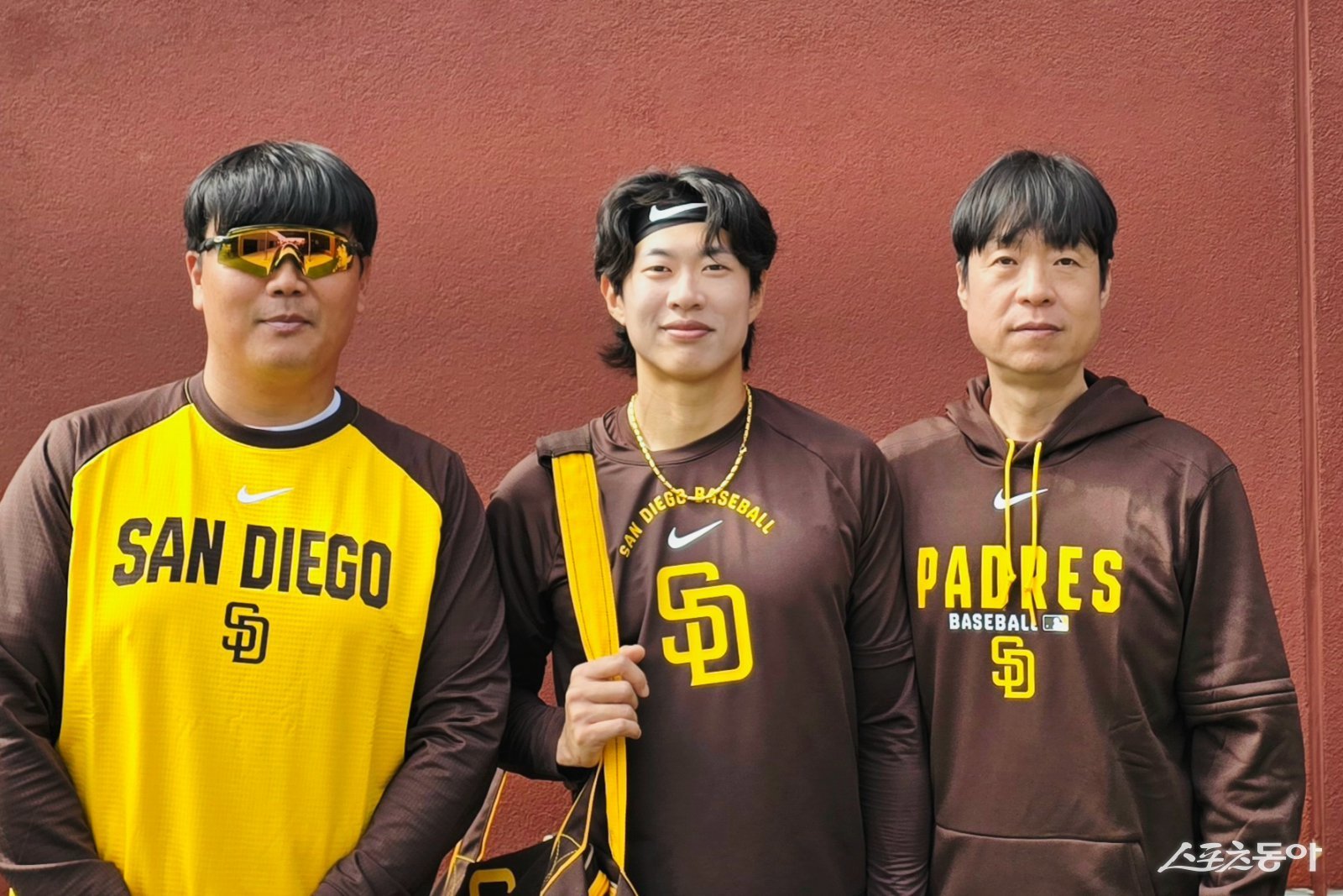 허문회 전 롯데 감독(오른쪽)이 샌디에이고 송성문의 개인 코디네이터로 현지 훈련 적응과 경기력 향상을 돕고 있다. 허 전 감독과 남궁훈 샌디에이고 아시아 지역 담당 스카우트(왼쪽), 송성문이 미국 애리조나 피오리아 스포츠 콤플렉스서 의기투합하고 있다. 사진제공|허문회