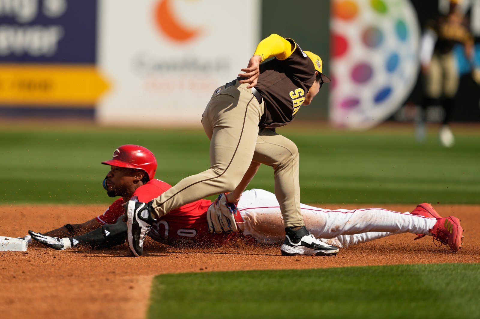 샌디에이고 송성문이 지난달 27일(한국시간) 굿이어 볼파크서 열린 신시내티와 시범경기 도중 상대 선수를 태그하고 있다. 애리조나|AP뉴시스