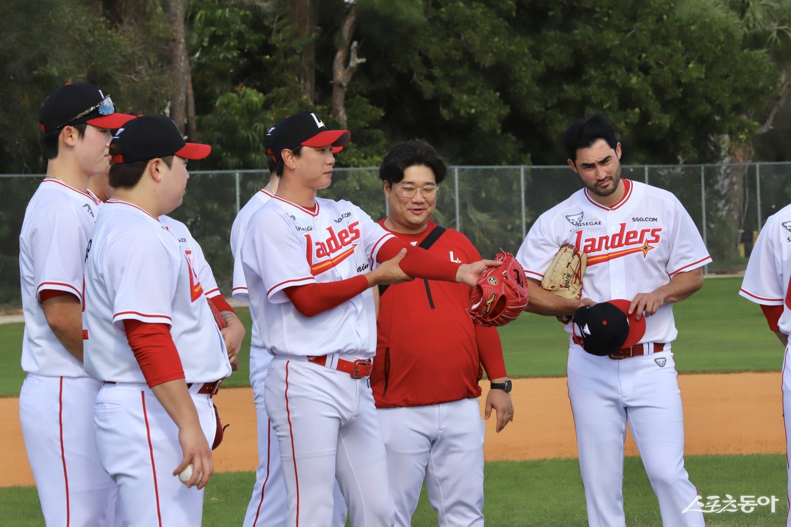 미국 플로리다 베로비치서 열린 SSG의 1차 스프링캠프 도중 훈련에 나선 김광현(가운데). 사진제공|SSG 랜더스
