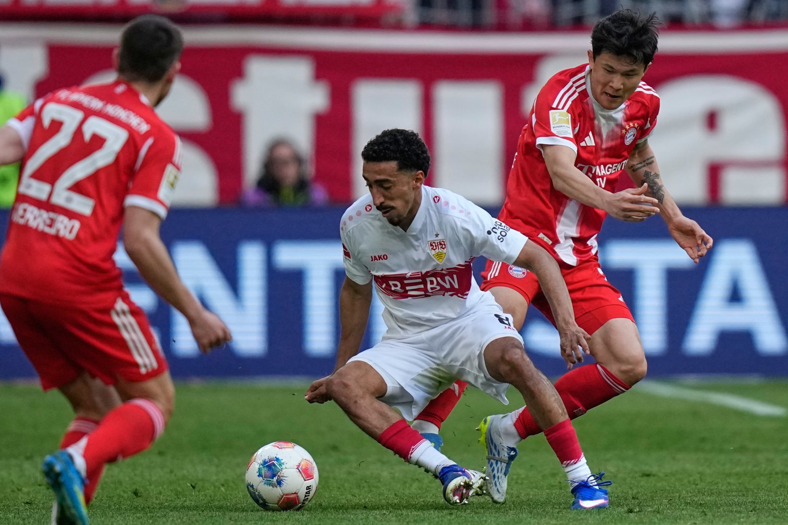 바이에른 뮌헨 김민재(오른쪽)가 20일(한국시간) 슈투트가르트와 홈경기서 상대 공격수 티아고 토마스의 전진을 차단하고 있다. 뮌헨|AP뉴시스