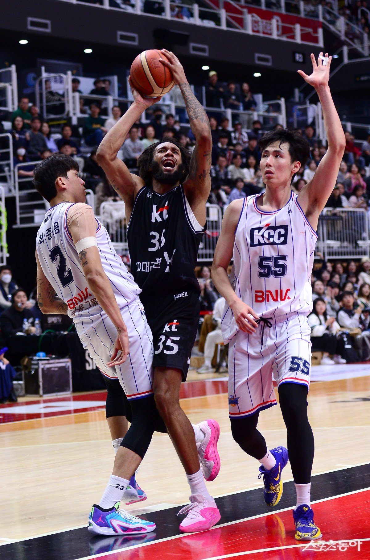 1일 수원 KT 아레나에서 열린 ‘2023-2024 프로농구’ KT와 KCC 경기에서 KT 배스가 KCC의 수비를 뚫고 골밑 슛을 하고 있다.