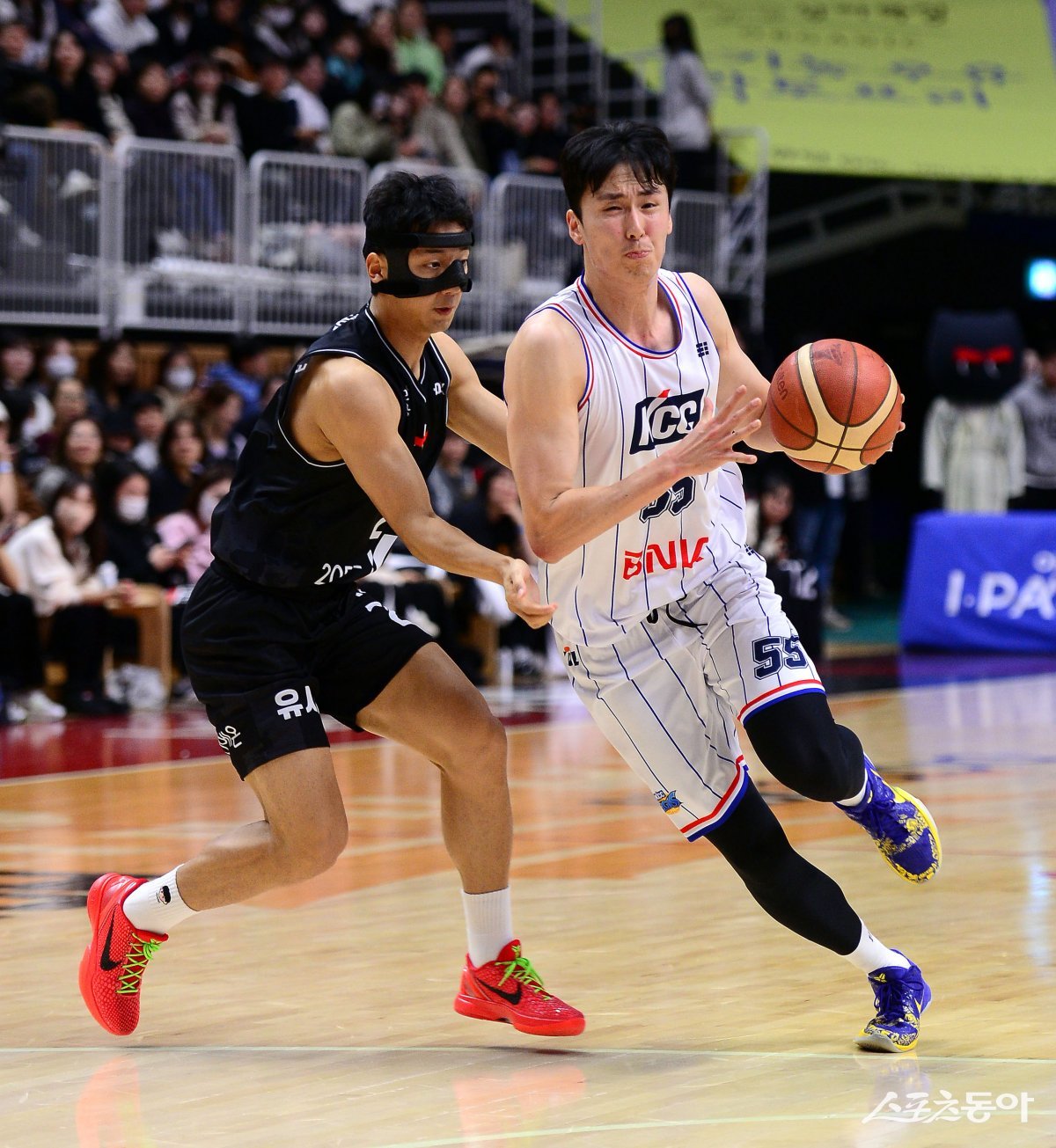 1일 수원 KT 아레나에서 열린 ‘2023-2024 프로농구’ KT와 KCC 경기에서 KCC 송교창이 KT 허훈의 수비를 뚫고 골밑을 공격하고 있다.