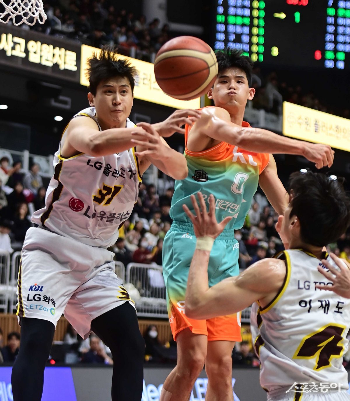 28일 수원KT소닉붐아레나에서 열린 ‘2023-2024 정관장 프로농구’ 수원 KT와 창원 LG의 경기에서 LG 박정현, KT 하윤기가 리바운드된 볼을 향해 손을 뻗고 있다.