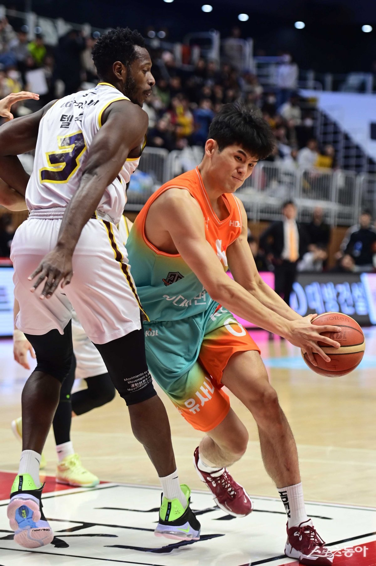 28일 수원KT소닉붐아레나에서 열린 ‘2023-2024 정관장 프로농구’ 수원 KT와 창원 LG의 경기에서 KT 하윤기가 LG 수비를 뚫고 골밑 돌파를 하고 있다.