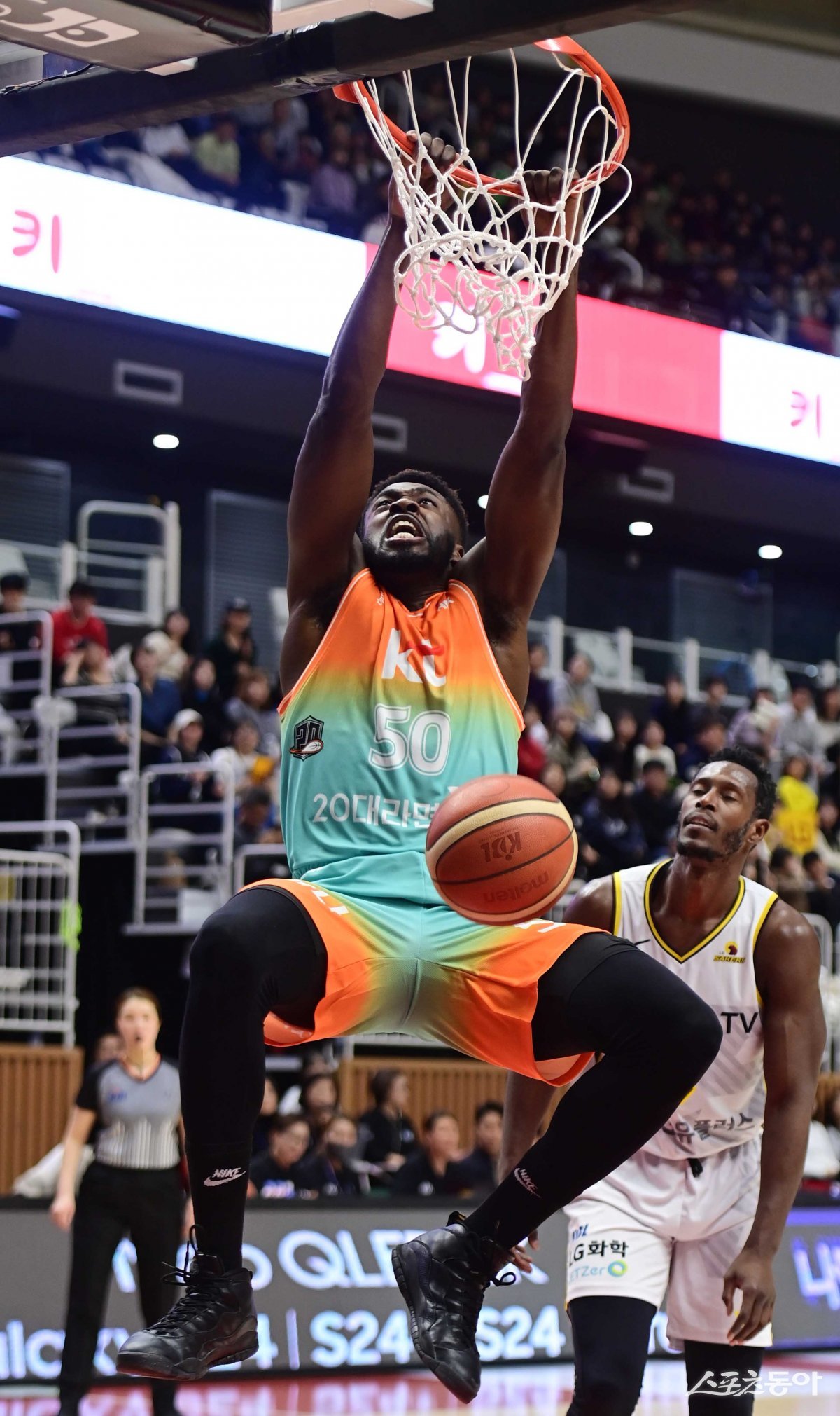 28일 수원KT소닉붐아레나에서 열린 ‘2023-2024 정관장 프로농구’ 수원 KT와 창원 LG의 경기에서 KT 에릭이 덩크를 성공시키고 있다.