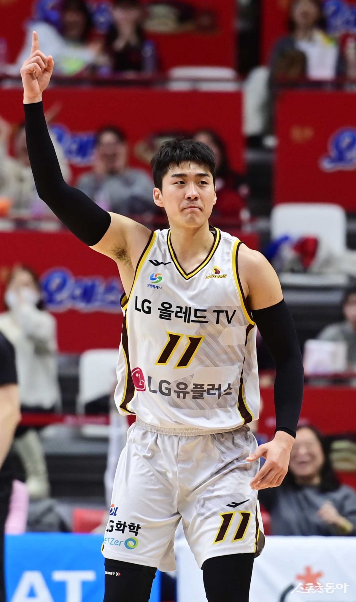 28일 수원KT소닉붐아레나에서 열린 ‘2023-2024 정관장 프로농구’ 수원 KT와 창원 LG의 경기에서 3점슛을 성공시킨 LG 양홍석이 세리머니를 하고 있다.