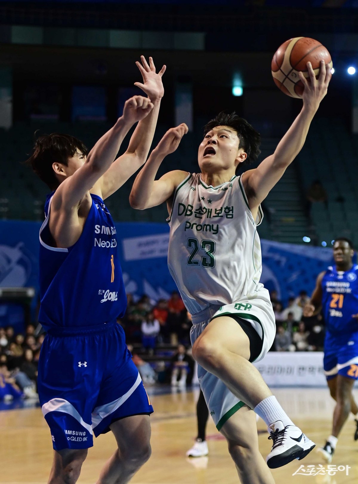 30일 서울 잠실실내체육관에서 열린 ‘2023-2024 정관장 프로농구’ 서울 삼성과 원주 DB의 경기에서 DB 박인웅이 삼성의 수비 앞에서 슛을 하고 있다.