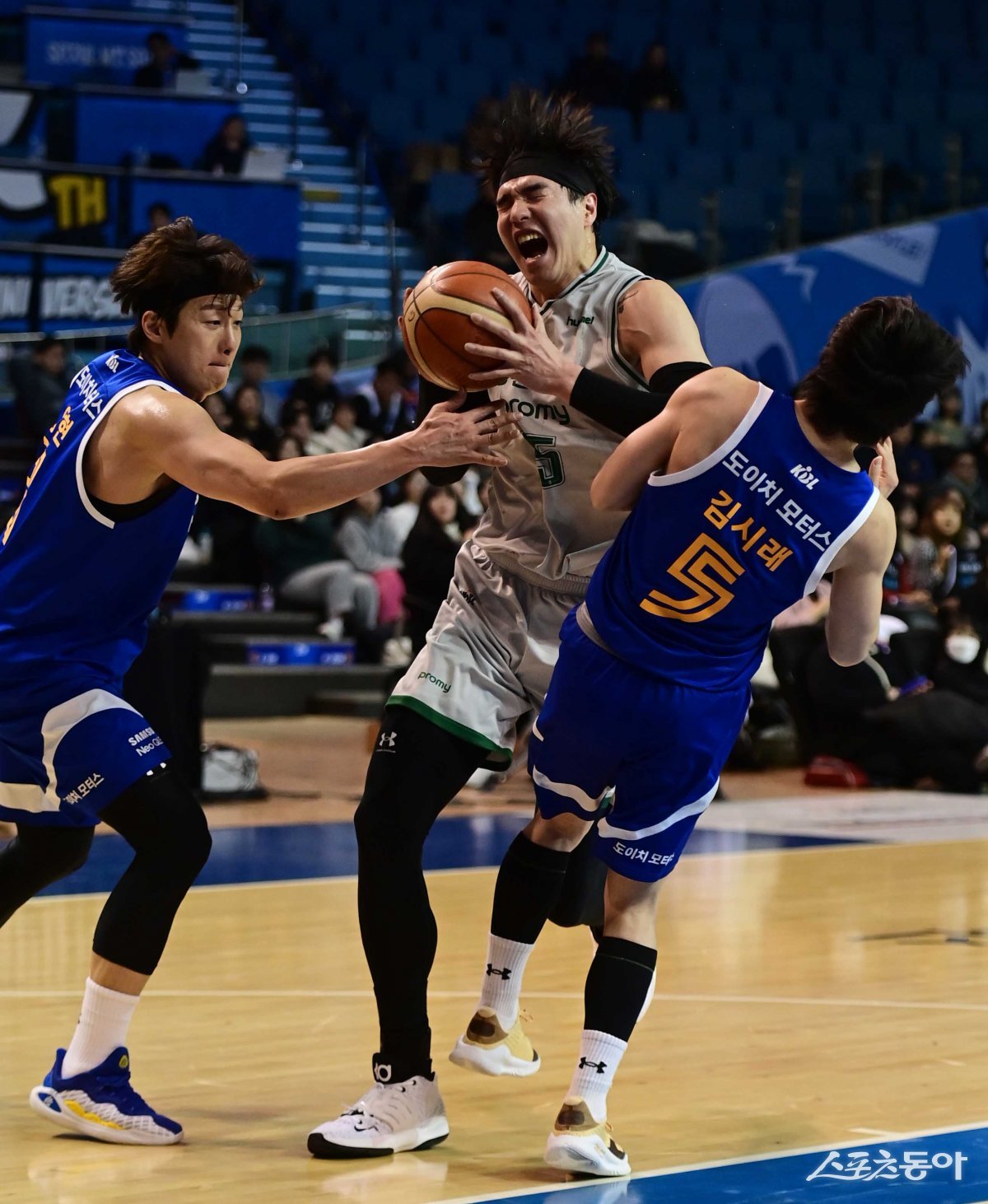30일 서울 잠실실내체육관에서 열린 ‘2023-2024 정관장 프로농구’ 서울 삼성과 원주 DB의 경기에서 DB 김종규가 삼성의 수비를 뚫고 골밑 돌파를 하고 있다.