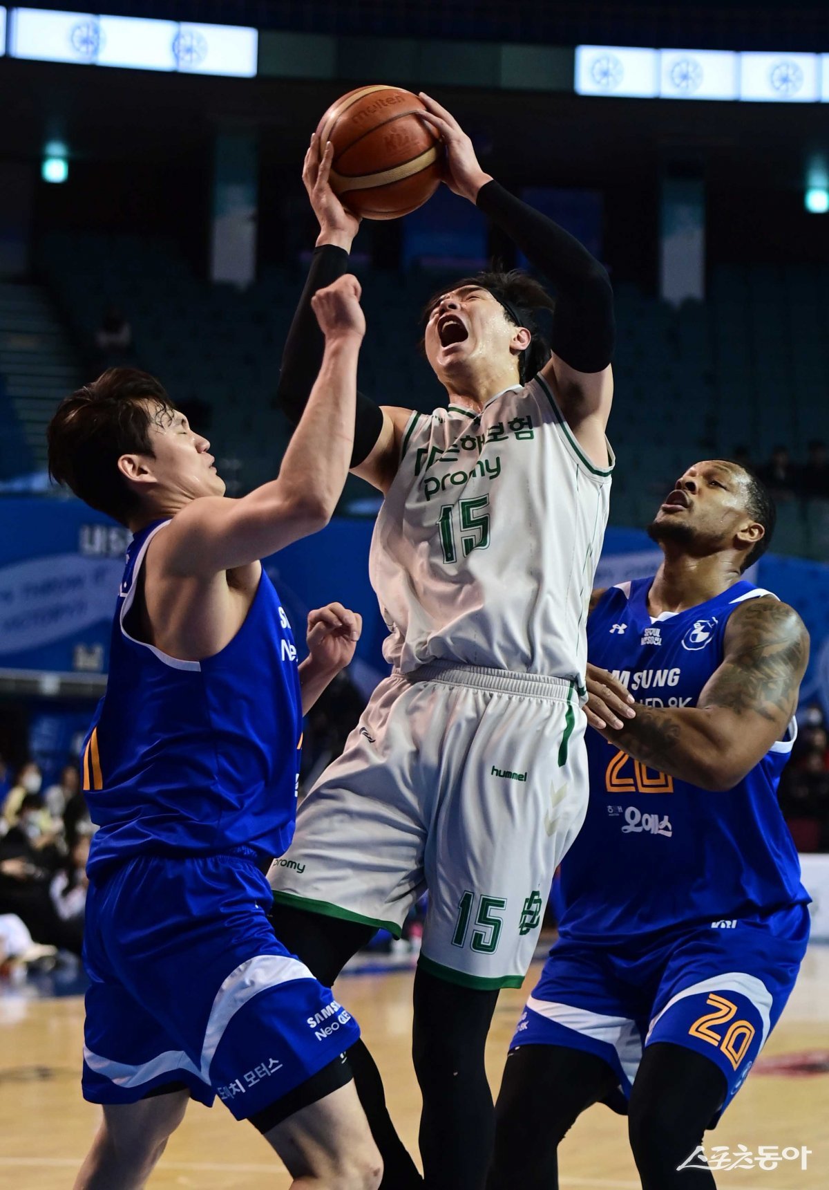 30일 서울 잠실실내체육관에서 열린 ‘2023-2024 정관장 프로농구’ 서울 삼성과 원주 DB의 경기에서 DB 김종규가 삼성 수비 사이에서 슛을 하고 있다.