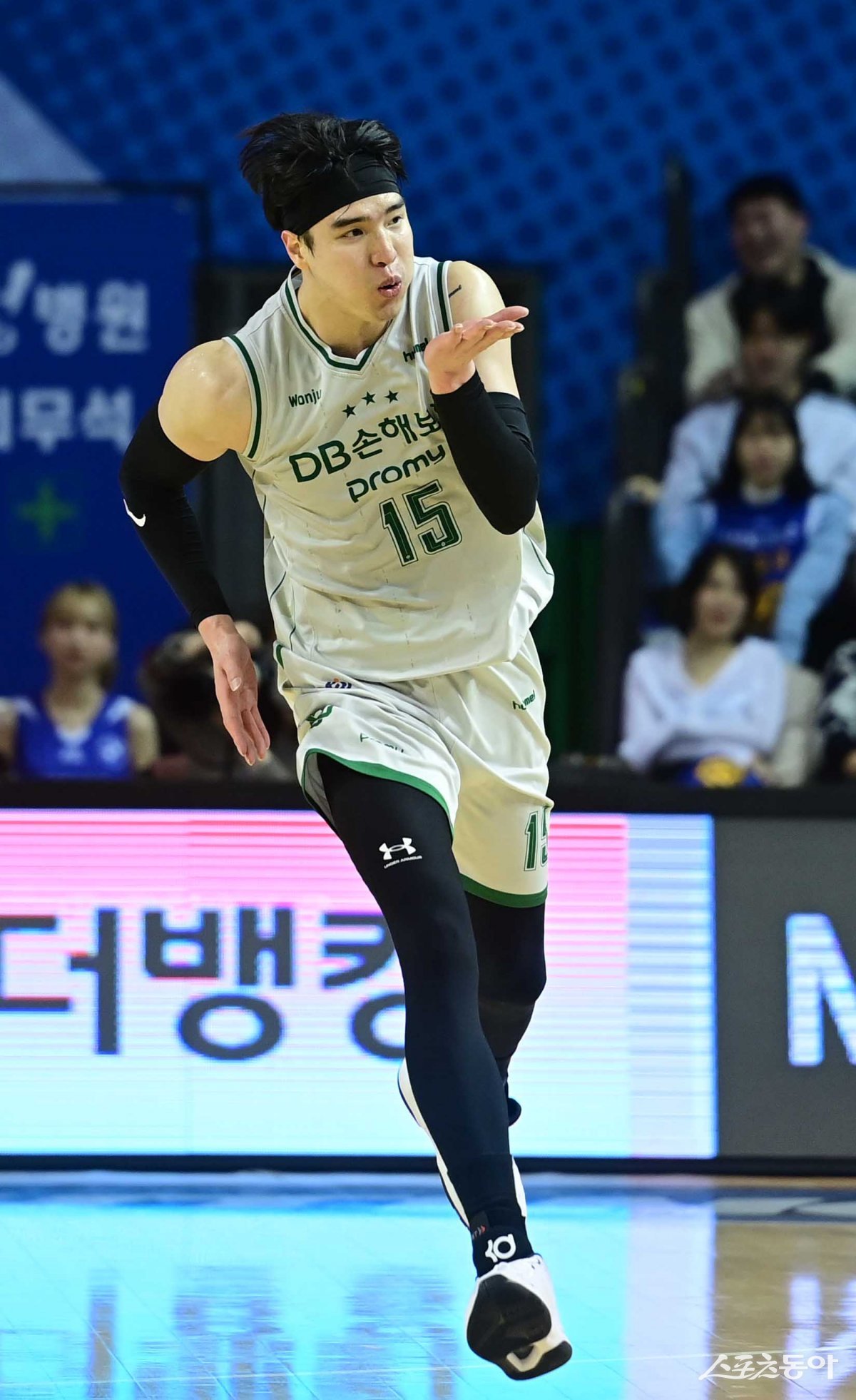 30일 서울 잠실실내체육관에서 열린 ‘2023-2024 정관장 프로농구’ 서울 삼성과 원주 DB의 경기에서 덩크를 성공시킨 DB 이종규가 세리머니를 하고 있다.