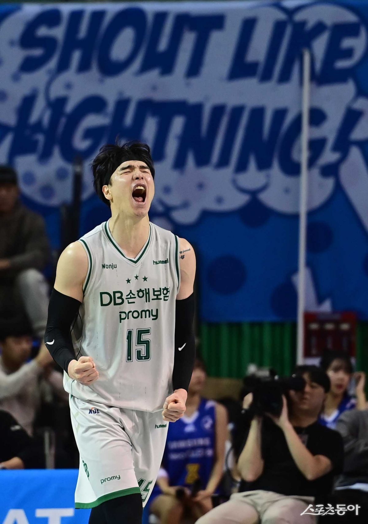 30일 서울 잠실실내체육관에서 열린 ‘2023-2024 정관장 프로농구’ 서울 삼성과 원주 DB의 경기에서 득점에 성공한 DB 김종규가 포효하고 있다.