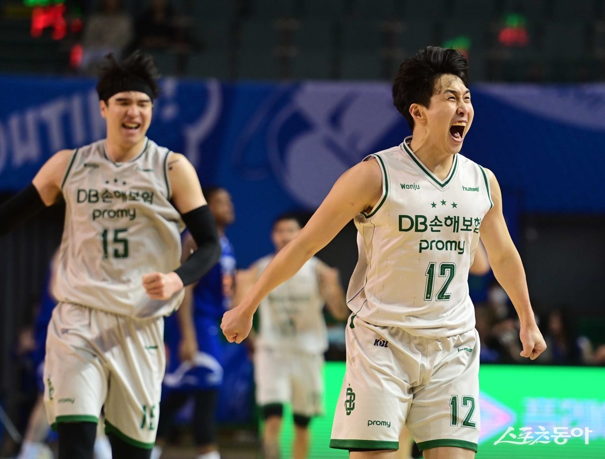 30일 서울 잠실실내체육관에서 열린 ‘2023-2024 정관장 프로농구’ 서울 삼성과 원주 DB의 경기에서 3점슛을 성공시킨 DB 김영현이 기뻐하고 있다.