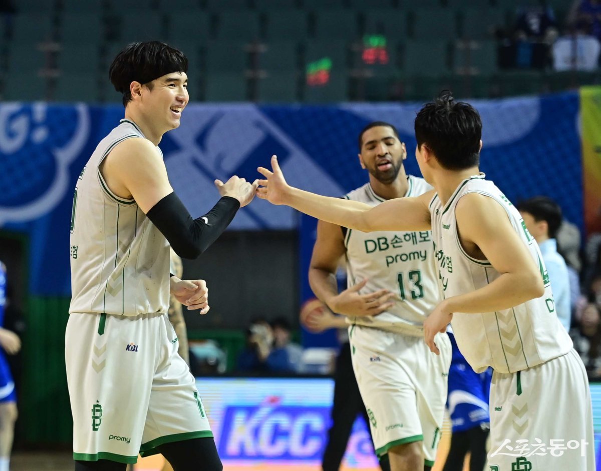 30일 서울 잠실실내체육관에서 열린 ‘2023-2024 정관장 프로농구’ 서울 삼성과 원주 DB의 경기에서 득점에 성공한 DB 김종규가 동료와 기쁨을 나누고 있다.