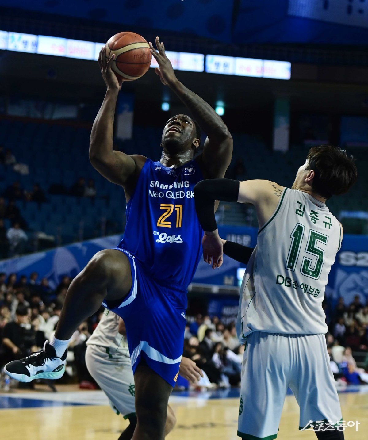 30일 서울 잠실실내체육관에서 열린 ‘2023-2024 정관장 프로농구’ 서울 삼성과 원주 DB의 경기에서 삼성 코번이 DB 수비를 뚫고 슛을 하고 있다.