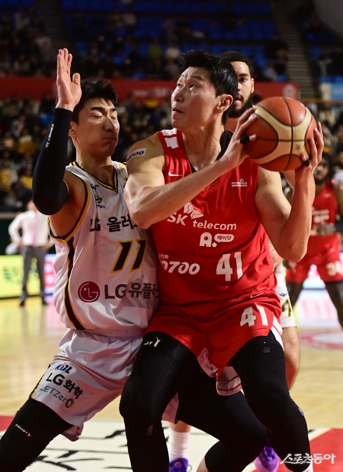 15일 서울 잠실학생체육관에서 열린 ‘2023-2024 정관장 프로농구’ 서울 SK와 창원 LG의 경기에서 SK 오세근이 LG 양홍석의 수비 앞에서 슛을 하고 있다.
