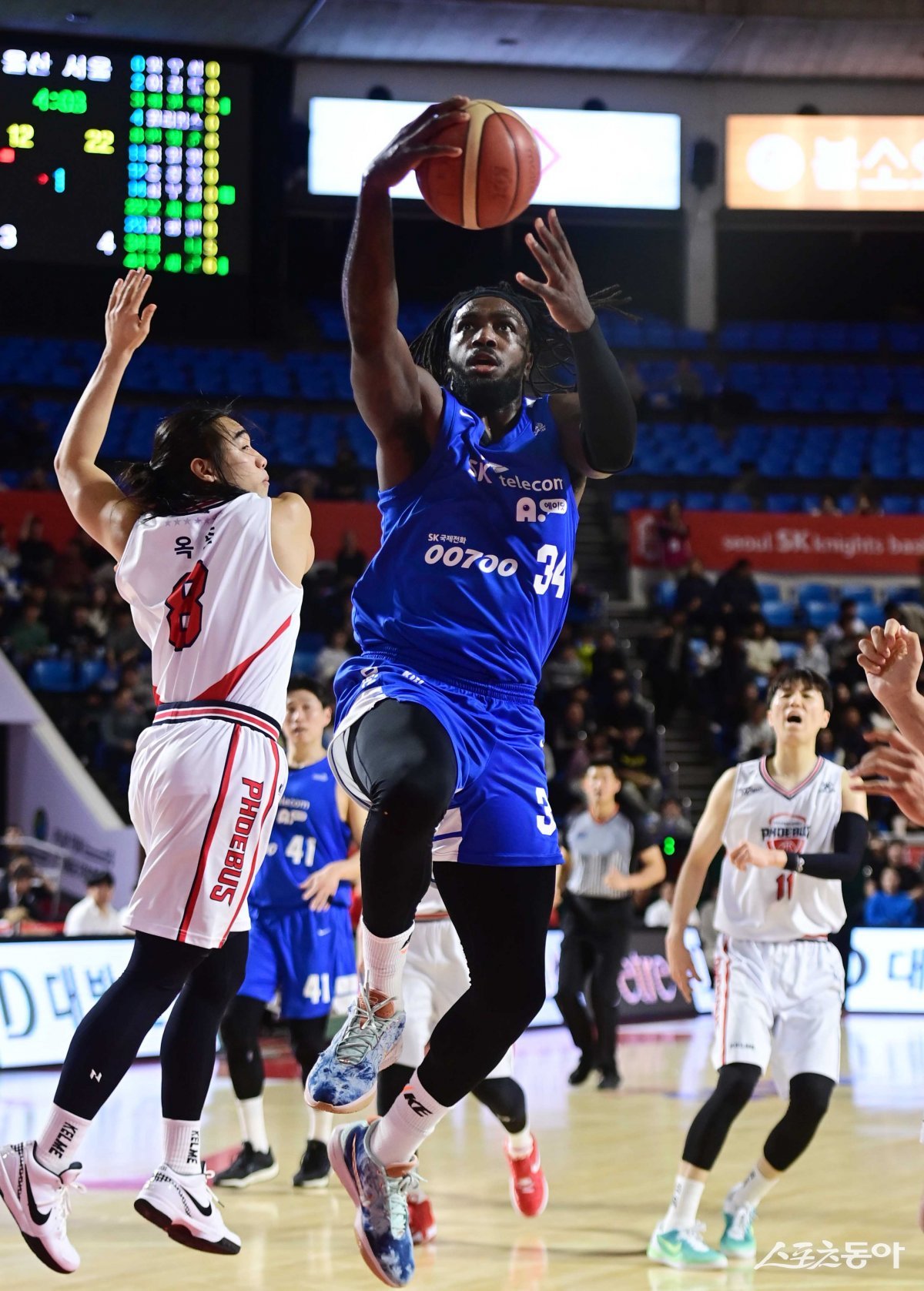 5일 서울 잠실학생체육관에서 열린 ‘2023-2024 정관장 프로농구’ 서울 SK와 울산 현대모비스의 경기에서 SK 워니가 현대모비스 수비를 뚫고 슛을 하고 있다.