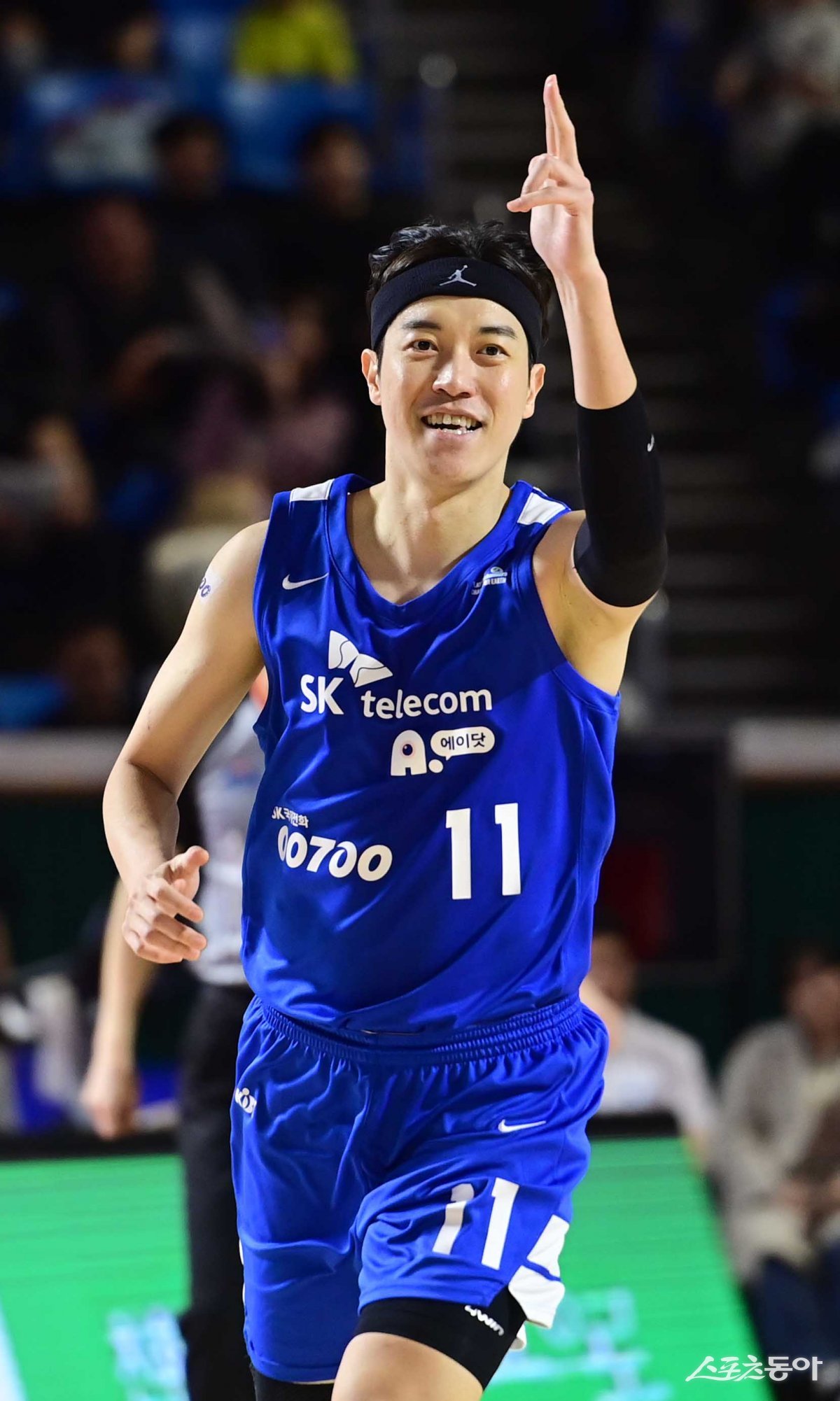 5일 서울 잠실학생체육관에서 열린 ‘2023-2024 정관장 프로농구’ 서울 SK와 울산 현대모비스의 경기에서 3점슛을 성공시킨 SK 허일영이 세리머니를 하고 있다.