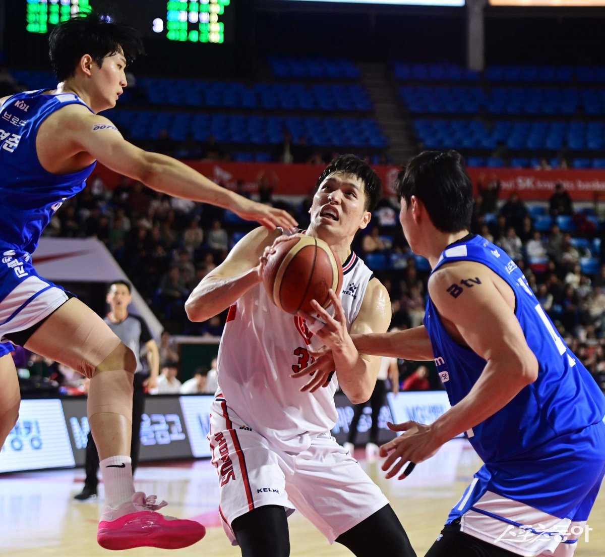 5일 서울 잠실학생체육관에서 열린 ‘2023-2024 정관장 프로농구’ 서울 SK와 울산 현대모비스의 경기에서 현대모비스 장재석이 SK 수비 사이에서 슛을 하고 있다.