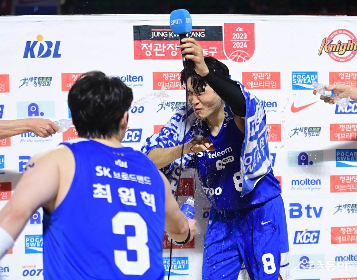 5일 서울 잠실학생체육관에서 열린 ‘2023-2024 정관장 프로농구’ 서울 SK와 울산 현대모비스의 경기에서 105-76으로 승리한 SK 안영준이 물 세례를 받고 있다.