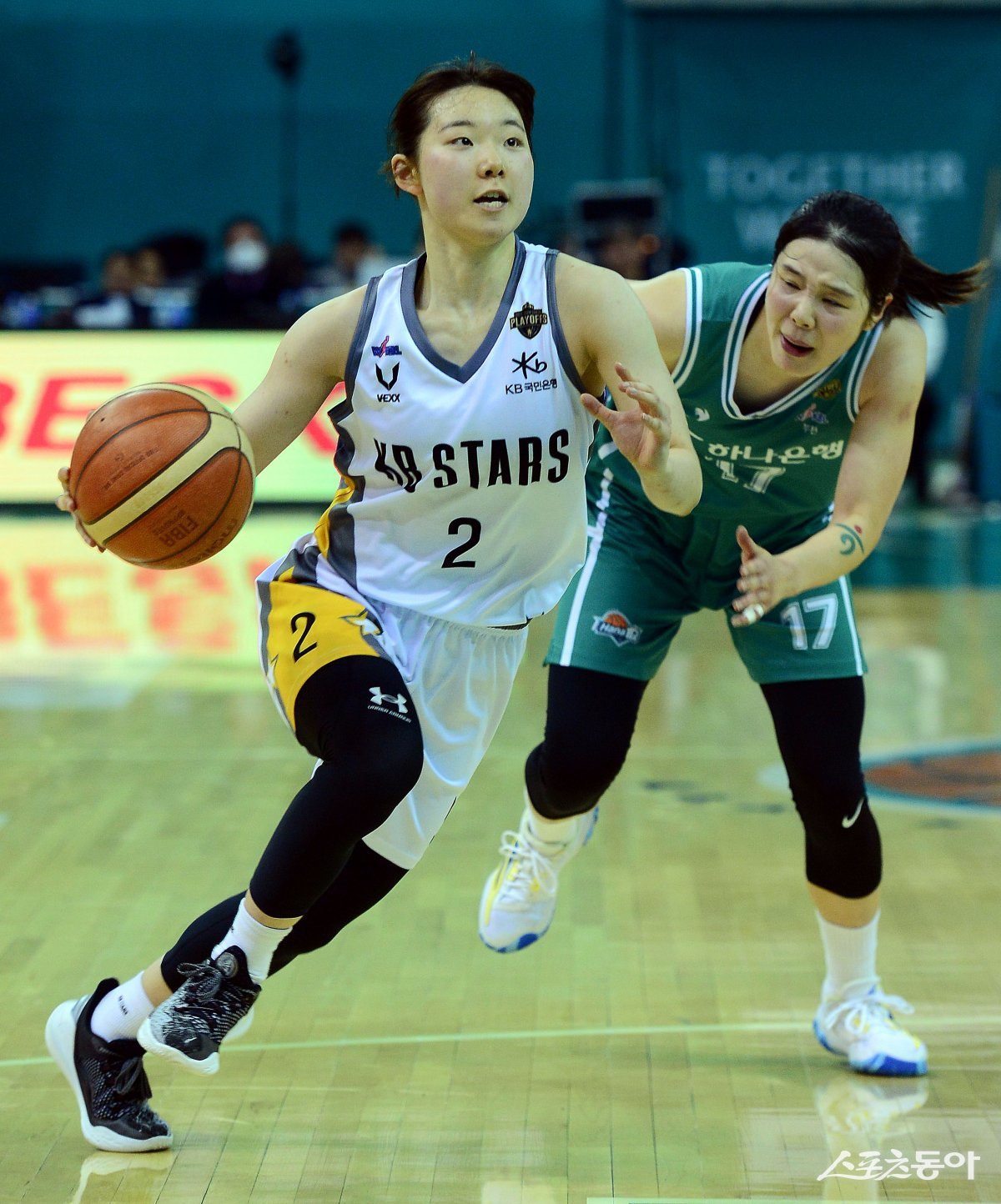 13일 경기도 부천실내체육관에서 열린 ‘우리은행 우리 WON 2023-2024 여자프로농구’ 청주 KB와 부천 하나원큐의 4강 플레이오프 경기에서 KB 허예은이 하나원큐 김시온의 수비를 제치며 돌파하고 있다. 부천 | 김민성 기자 marineboy@donga.com