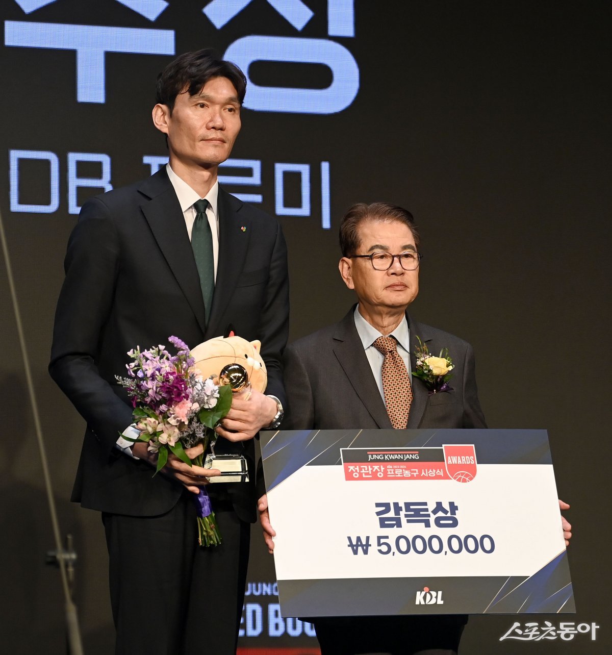 1일 그랜드 인터컨티넨탈 서울 파르나스에서 2023-2024 프로농구 시상식이 열렸다. 감독상을 수상한 DB 김주성 감독이 KBA 권혁운 회장과 하고 있다.