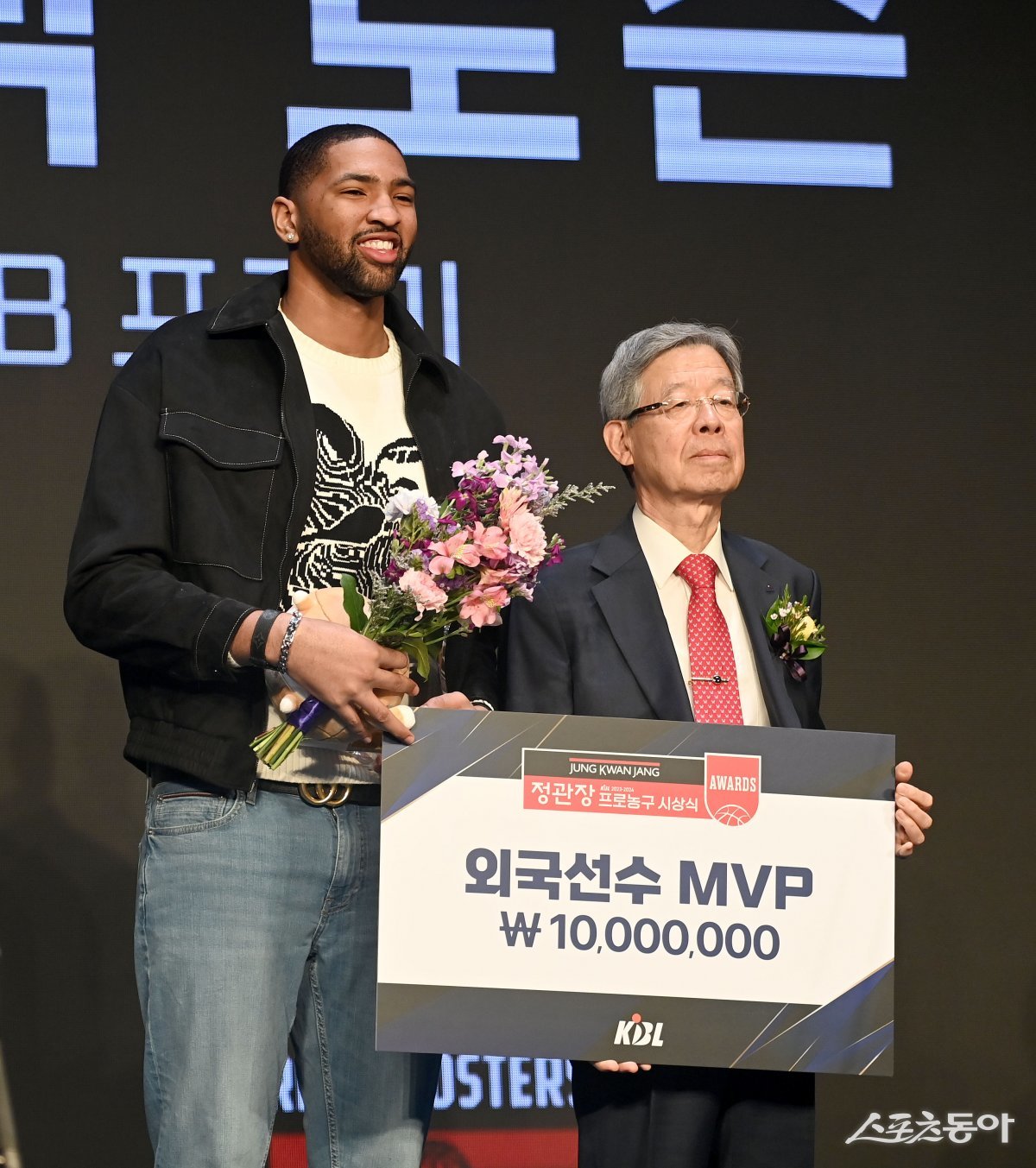 1일 그랜드 인터컨티넨탈 서울 파르나스에서 2023-2024 프로농구 시상식이 열렸다. 외국선수 MVP에 선정된 DB 로슨이 KBL 김희옥 총재와 기념촬영을 하고 있다.