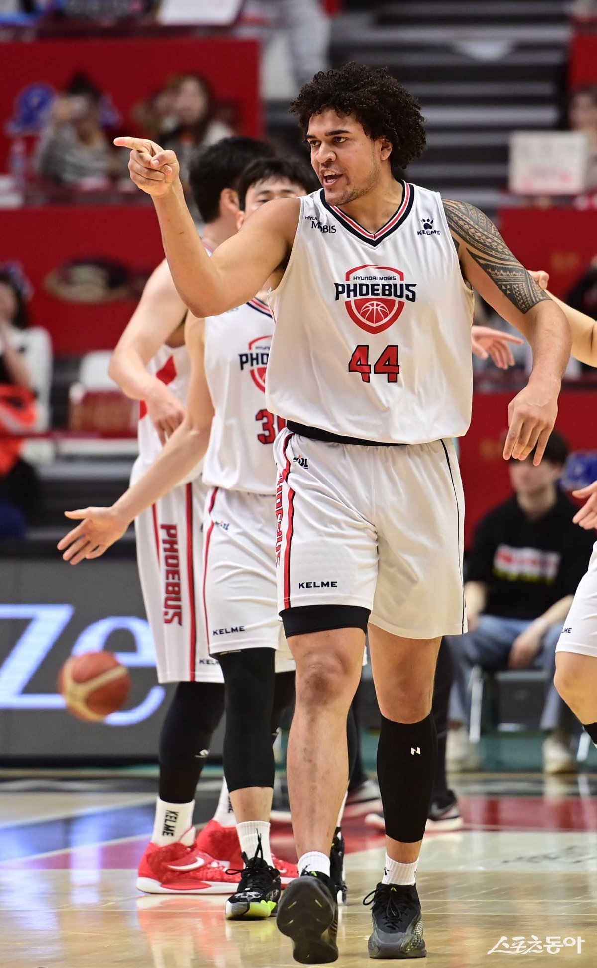 7일 경기도 수원KT소닉붐아레나에서 열린 ‘2023-2024 정관장 프로농구’ 6강 플레이오프 2차전 수원 KT와 울산 현대모비스의 경기에서 득점에 성공한 현대모비스 프림이 KT 벤치를 향해 손짓하고 있다.